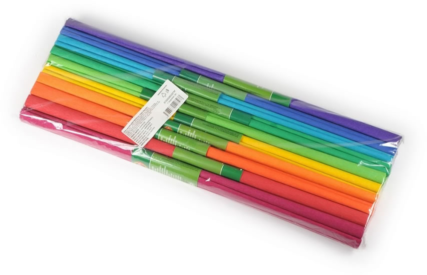 Výrobek se používá jako krepový papír pro školní, výtvarné a aranžérské práce. Souprava krepového papíru 10 ks v následujících barvách: vínová, červená, tmavě oranžová, světle oranžová, tmavě žlutá, světle zelená, zelená, tyrkysová, modrá, tmavě fialová. Jednotný krepový papír o rozměru 2000 x 500 mm je složen do balíčku o rozměrech cca 500 x 35 x 18 mm. 10 kusů krepového papíru je vloženo do folie. Stupeň krepování 30-40 %.
