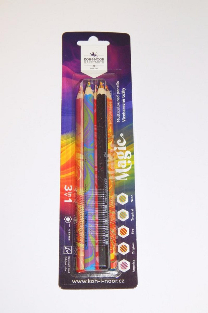 Souprava 5 ks pastelových tužek MAGIC – Original, Tropical, Fire, Neon, USA červená v blistru. Šestihranné pastelové tužky MAGIC, v dřevěném plášti se speciálním tříbarevným jádrem. Magický efekt – duhová pastelka - 3 barvy v jedné tuze. Tužka vytváří vícebarevnou stopu, která se mění natočením hrotu. Jsou určeny pro školní, umělecké nebo i pro speciální použití.