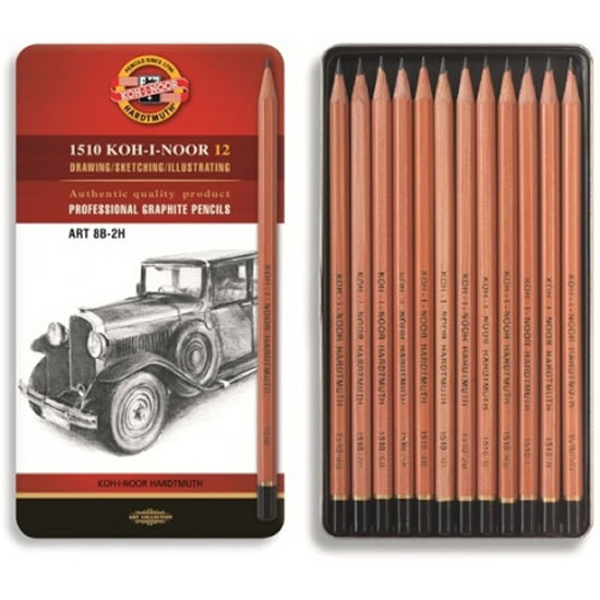 Souprava grafitových tužek v přírodním provedení 1512N - 12 ks tužek v plechovém obalu. Šestihranné grafitové tužky v dřevěném cedrovém plášti. Grafitové jádro je ve 12 stupních tvrdosti 8B – 2H. Gradace jsou přesně dodržovány. Tužky jsou určeny pro výtvarníky a umělce.