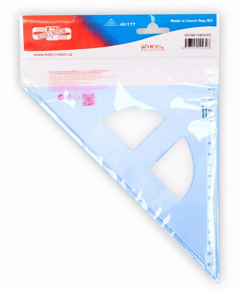 Trojúhelník 45/177 s kolmicí vyrobený z modrého průhledného polystyrenu. Stupnice je naražena technologií horké ražby. Přesnost stupnice 0,2% délky. Mimo délkové stupnice je vybaven i ryskou pro konstruování kolmic. Trojúhelník je určený k rýsování a technickému kreslení ve škole i v kanceláři. Zabalen je do polyetylenového sáčku s eurozávěsem.