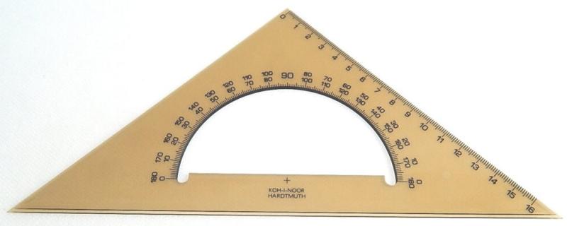 Trojúhelník 45/177 s úhloměrem vyrobený z kouřového průhledného polystyrenu. Stupnice tištěny technologií přesného sítotisku. Tisk stupnic je odolný proti opotřebení při běžném používání. Přesnost délkové stupnice 0,2% délky. Mimo délkové stupnice na odvěsně je trojúhelník vybaven obloukovým výřezem s úhloměrnou stupnicí 0 - 180° k měření a rýsování úhlů. Trojúhelník je určený k technickému kreslení a rýsování ve škole i v kanceláři. Výhodou je spojení trojúhelníku s ryskou a úhloměru 180° v jeden výrobek. Zabalen je do polyetylenového sáčku s eurozávěsem.