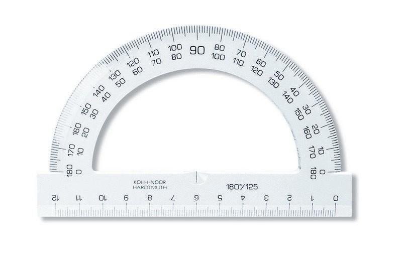 Úhloměr 180/125 vyrobený z čirého průhledného polystyrenu. Stupnice tištěny technologií přesného sítotisku. Tisk stupnic je odolný proti opotřebení při běžném používání. Mimo dvou úhloměrných stupnic na oblouku je na přeponě natištěna 120 mm dlouhá délková stupnice. Úhloměr je určený k rýsování a technickému kreslení ve škole i v kanceláři. Zabalen je do polyetylenového sáčku s eurozávěsem.