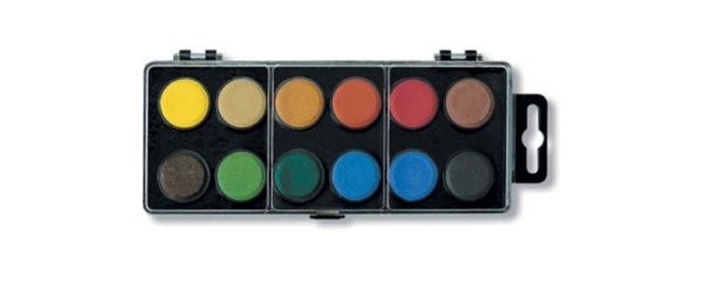 Klasické vodové barvy v soupravách. Mají jasné a syté barvy. Velikost tablet je menší, 22,5 mm v průměru.