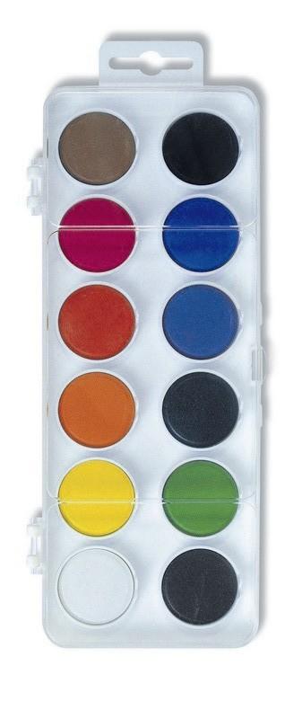 Školní vodové barvy 12ti odstínů s tabletami o průměru 22,5 mm v obdélníkových, plastových, jednopatrových barevnících s transparentním víčkem. Barvy jsou výrazné, vyznačují se svým vysokým obsahem pigmentů. Jsou certifikované a zcela bezpečné pro děti.