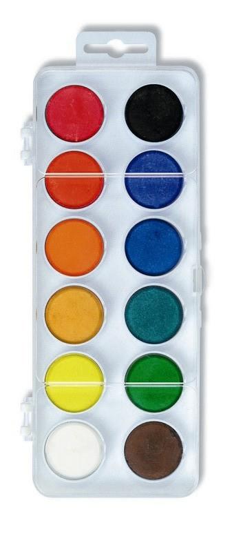 Školní vodové barvy 12ti odstínů s tabletami o průměru 30 mm v obdélníkových, plastových, jednopatrových barevnících s transparentním víčkem. Barvy jsou výrazné, vyznačují se svým vysokým obsahem pigmentů. Jsou certifikované a zcela bezpečné pro děti.