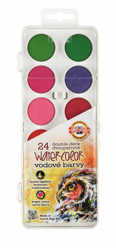 Školní vodové barvy 24 odstínů s tabletami o průměru 30 mm v obdélníkových, dvoupatrových, plastových barevnících s papírovou vložkou. Barvy jsou řazeny ve dvou patrech po 12ti odstínech, mají vysoký obsah pigmentu. Jsou certifikované a zcela bezpečné pro děti.