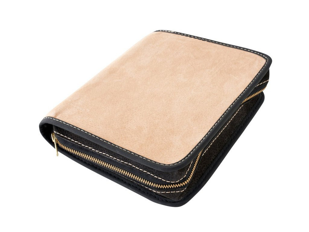 Přírodní kůže, kovový zip, ruční práce. Vhodné pro knihy o maximálních rozměrech: Výška: 22 cm, Šířka (součet 2x šířka + hřbet): 40 cm