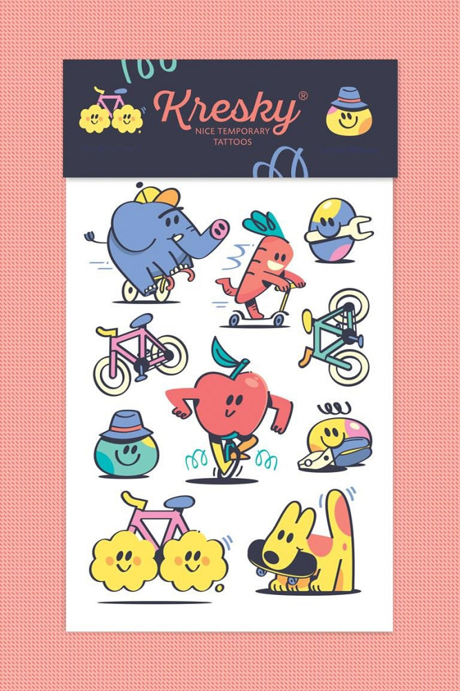 Co vám chybělo ke šťastné jízdě na kole? Veselé tetovačky na kolech vám zpříjemní každou chvíli s větrem ve vlasech nebo při opravě defektu. Jablko jezdí na jednokolce, slon na kole, mrkev na koloběžce a skateboard zachutnal psovi. A může se vyrazit na výlet! Tetovačky Kresky - Na kolech vznikly ve spolupráci s Cyklo WERKSTATT a ilustrace navrhl Jan Strelec. Tetovačky jsou vyrobeny i s bílou barvou.
