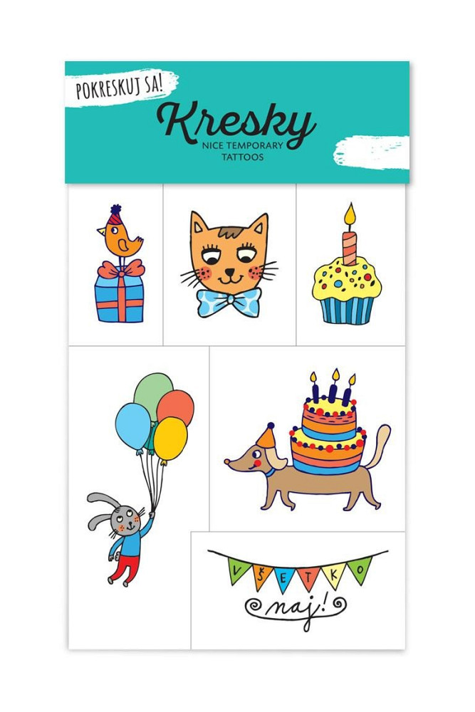 Všichni ruce nahoru! Zábavné Kresky vhodné na každou oslavu. Dokonalá party, na kterou budete vzpomínat ještě pár dní po skončení, vždy, když si na ruce najdete Kresku jezevčíka s dortem na hřbetě. Dočasné tetování neaplikujte na citlivou pokožku, v blízkosti očí nebo v případě alergie. Dermatologicky testováno, bezpečné pro děti.