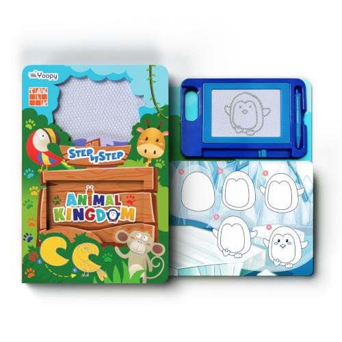 Jak rychle a jednoduše nakreslit velrybu, žirafu, kocovinu, chameleona či jiná zvířátka? ***** Kniha je z magnetické tabulky s perem a obrázkovým návodem s přesným postupem, jak kreslit zvířátka. Pero dobře padne do dětské rukojeti a k tabulce je připevněno provázkem. ***** Práce s knihou je mimořádně jednoduchá. Stačí sledovat očíslované skici a podle jejich vzoru postupně kreslit milá zvířátka. Že jste se spletli? Nevadí. Nevydařený obrázek rychle setřete jedním tahem. A kreativní chvilky mohou pokračovat. Knížka Step by step navíc vyřeší nedostatek papíru u vás doma i neustálé dokupování barviček či fixů.
