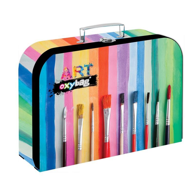 Lamino kufřík na výtvarnou výchovu. Do kufříku se vejde formát A4. Materiál: papír, lepenka, kovový zámeček, kovové nýty.