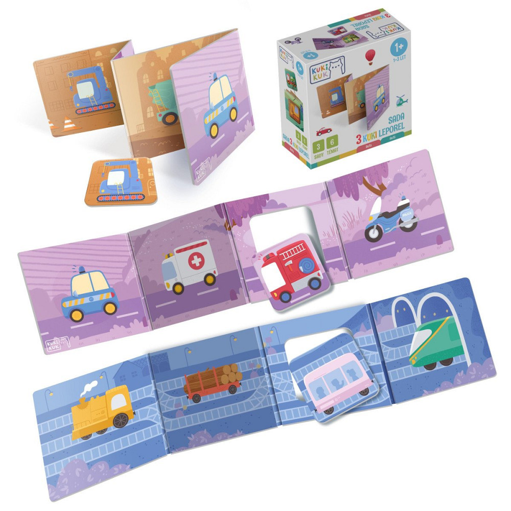 Tři oboustranná harmoniková leporela s okénky a čtvercovými vkládacími žetony. Na každém leporelu najdete čtyři vozidla vždy z jednoho tematického světa - staveniště, záchranáři, železnice atd. - celkem šest prostředí a 24 vozidel. Děti objevují nové možnosti, hrají si s výřezy a pohyblivými dílky. Díky různým kombinacím stránek vznikají nečekané průhledy a překvapení.