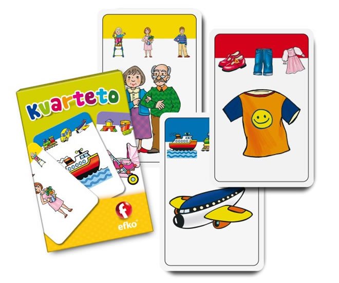 Nejoblíbenější dětská karetní hra s veselými barevnými obrázky. Získej všechny 4 karty se stejným symbolem! Kdo má kartu, která ti chybí? Vyhrává ten, kdo má na konci hry největší počet čtveřic (kvartet). Obsahuje 32 karet. Vyrobeno v České republice.