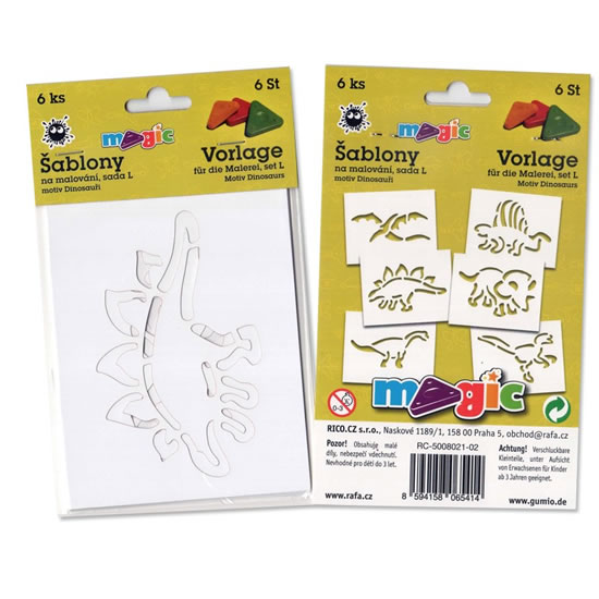 Sada 6ks papírové šablony na malování. Materiál bílý karton 220g. Doporučujeme pro malování s magickými voskovkami (technika frotáž), vhodné i pro tupování s temperami, pro malování s foukacími fixami nebo techniku malování plastelínou. Rozměry 11x14cm.