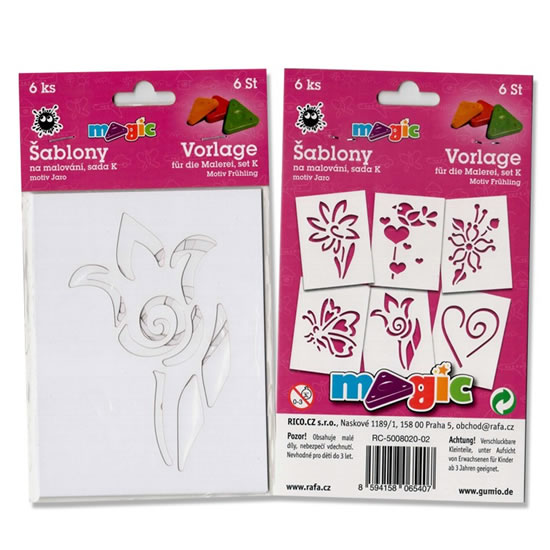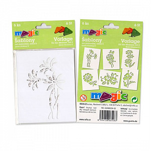 Sada 6ks papírové šablony na malování. Materiál bílý karton 220g. Doporučujeme pro malování s magickými voskovkami (technika frotáž), vhodné i pro tupování s temperami, pro malování s foukacími fixami nebo techniku malování plastelínou. Rozměry 11x14cm.