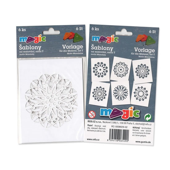 Sada 6ks papírové šablony na malování. Materiál bílý karton 220g. Doporučujeme pro malování s magickými voskovkami (technika frotáž), vhodné i pro tupování s temperami, pro malování s foukacími fixami nebo techniku malování plastelínou. Rozměry 11x14cm.
