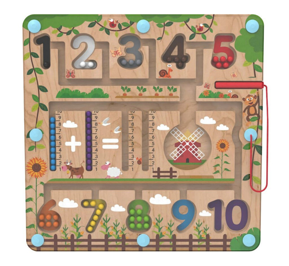 Vydejte se na cestu přírodou s barevnými kuličkami. Provedete úspěšně různobarevné kuličky všemi zákoutími? Umístíte všechny do mlýna? Vejdou se tam? Nebo pomocí čísel na metru vytvoříte a vypočítáte příklad? K vedení kuliček se při hře využívá magnetické ukazovátko, které prověří dětskou trpělivost a koordinaci rukou a zraku. Dokážete pak navrátit kuličky zpět na své místo podle barvy? Je počet kuliček stejný jako číslo, do kterého jste je umístili? Zábavná dřevěná hra, která pomáhá dětem rozvíjet jemnou motoriku, orientovat se v prostoru a rozšiřovat slovní zásobu pojmenováváním barev a předmětů ve městě. Děti se také učí počítání zábavnou formou. Dřevěná základna v designu přírody je kryta odolnou průhlednou plastovou deskou, hračka je díky tomu bezpečná.