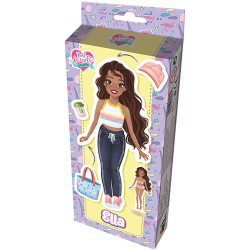 Balenie obsahuje obliekaciu postavičku, 3 hárky magnetických častí oblečenia, topánok a doplnkova drevený podstavec.