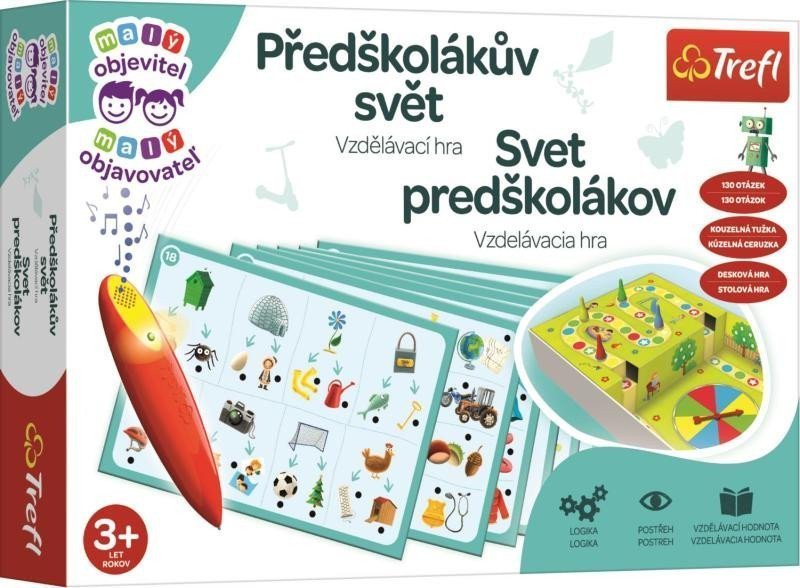 Veselá hra pro děti s kouzelným perem! Vzdělávací paměťová hra z edice her pro nejmenší Malý objevitel . Tato veselá hra podporuje rozmanitost slovní zásoby u dětí a učí je základním počtům a rozeznávání tvarů a barev. Předškolákův svět rozvíjí vědomosti malého objevitele o kolním světě. Hra podpoří kognitivní zvědavost vašich dětí i jejich touhu prozkoumávat jejich prostředí. Součástí balení je i magické pero, které po zvolení správné odpovědi vydá zvukový signál. Úkoly na deskách pokrývají různé obory související s předškolním vzděláváním: - písmena a první slova - slovní úkoly - čísla a počty - barvy a tvary - úkoly související s logickým myšlením - schopnost třídit položky Balení obsahuje baterií napájenou kouzelnou tužku, 16 oboustranných karet s úkoly, hrací deska na kartonové vložce v krabici, losovací šipka, 4 figurky a návod ke hře. Doporučeno pro děti od 4 let. Kolekce her Malý objevitel je určena pro děti ve věku od 2 do 6 let. Každá hra byla navržena tak, aby podporovala poznávací a intelektuální rozvoj dětí. Rozvíjí logicko-matematické myšlení, stimuluje komunikační schopnosti a obohacuje slovní zásobu. Cvičí vyzuálněpohybovou koordinaci, trénuje paměť a soustředění, a povzbuzuje představivost a kreativitu. Hry z kolekce Malý objevitel v sobě snoubí zábavu a učení a možnosti tvůrčího trávení volného času s dítětem.