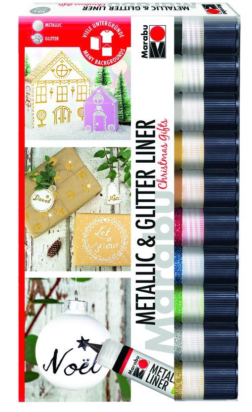 Se sadou vánočních dárků Metallic & Glitter Liner lze na Vánoce jednotlivě malovat a psát různé předměty. Vánoční ozdoby, ozdoby na stromek, barvy nebo dárky dostanou individuální nádech. Široká škála barev: 5 třpytivých a 5 metalických barev.