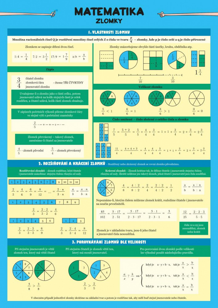 Tato laminová kartička je určená především pro studenty základní a střední školy. Podává přehled toho, jak zlomky fungují, k čemu slouží a jak si jednoduše osvojit jejich pravidla. V tomto hezkém provedení by tato karta měla studentům sloužit jako odrazový můstek ke správnému a praktickému užití zlomků během studia.