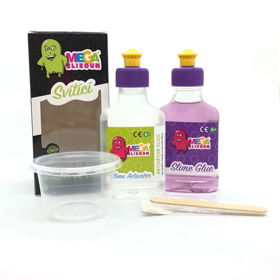 SVÍTÍCÍ MEGASLIZOUN – vyrob si sliz svítící ve tmě. Sada obsahuje: 100 ml fialového lepidla, 100 ml aktivátoru, 1,5 g svítícího prášku, špachtličku na míchání, misku s uzávěrem pro ukládání slizu