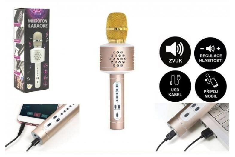 Bezdrátový karaoke mikrofon nesmí chybět na žádné párty. Pomocí kabelu nebo Bluetooth propojíte svůj telefon s mikrofonem. AUX konektor pro přehrávání hudby z mobilního telefonu, PC, tabletu nebo MP3/MP4 přehrávače. Obsahuje slot pro TF card - zapněte mikrofon delším stiskem tlačítka ON, vložte paměťovou kartu a mikrofon začne přehrávat hudbu uloženou na kartě. Můžete začít zpívat společeně s mikrofonem. AUX konektor - zapojte kabel s koncovkou do AUX slotu a druhou koncovku USB do mobilu, tabletu, PC nebo MP3. Mikrofon začne přehrávat hudbu, kterou si v připojeném zařízení vyberete a můžete začít zpívat. Při zapnutí mikrofonu Bluetooth pracuje spontánně. Pokud spojení nenaváže, hledá jiné Bt spojení. Pokud mikrofon nemůžete spárovat, zkontrolujte, zda zařízení, se kterým chcete mikrofon spárovat podporuje A2DP. Možné nastavení hlasitosti a intenzity hudby a ozvěny. Technické údaje: - bluetooth 4.2V, vzdálenost větší než 1m - reproduktory 2x 3W - frekvence 90 Hz - 10 KHz - baterie dobíjecí 3,7V 1500mAh lithium baterie (nevyměnitelná) - doba nabíjení 4,5 hod (vypnutý) - doba provozu při 50% hlasitosti je 14 hodin, při 100% hlasitosti je 9 hodin. Obsah balení: karaoke mikrofon, nabíjecí kabel USB do Micro USB, audiokabel, návod k obsluze. Barva: zlatá. Přejeme skvělou zábavu! Rozměry balení 10 x 28 x 9 cm. Není hračka.