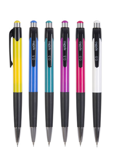 Plastová mikrotužka se zasouvacím hrotem a pogumovaným gripem pro pohodlný úchop. Kombinace 6 barev. Tuha: 0,5 mm.