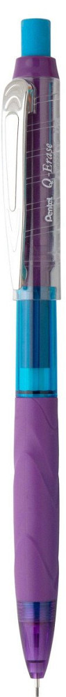 Mikrotužka Pentel Q-Erase, integrovaná pryž na konci mikrotužky, aktivuje se otočením, kovový klip pro uchycení, pugomovaný grip pro pohodlné držení. Fialová barva, transparentní tělo s barevným designem, šíře tuhy 0,5 mm.