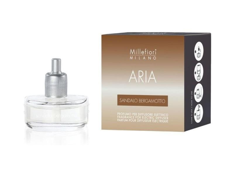 Santálové dřevo a bergamot - vzácné koření ze santálového dřeva je považované za symbol životní síly. Jeho intenzivní kořeněné aroma odstraňuje stres a nervozitu, zpomaluje ale neuspává, lehce se snoubí s čerstvým závanem levandule, grapefruit. K náplni je třeba mít elektrickou jednotku/strojek do zásuvky. Náplň má obsah 20 ml pro 6-8 týdnů vůně. V řadě ARIA je v nabídce 11 nejoblíbenějších vůní značky Millefiori plus funkční vůně Smoke s aktivními složkami, které efektivně neutralizují pach z cigaret.