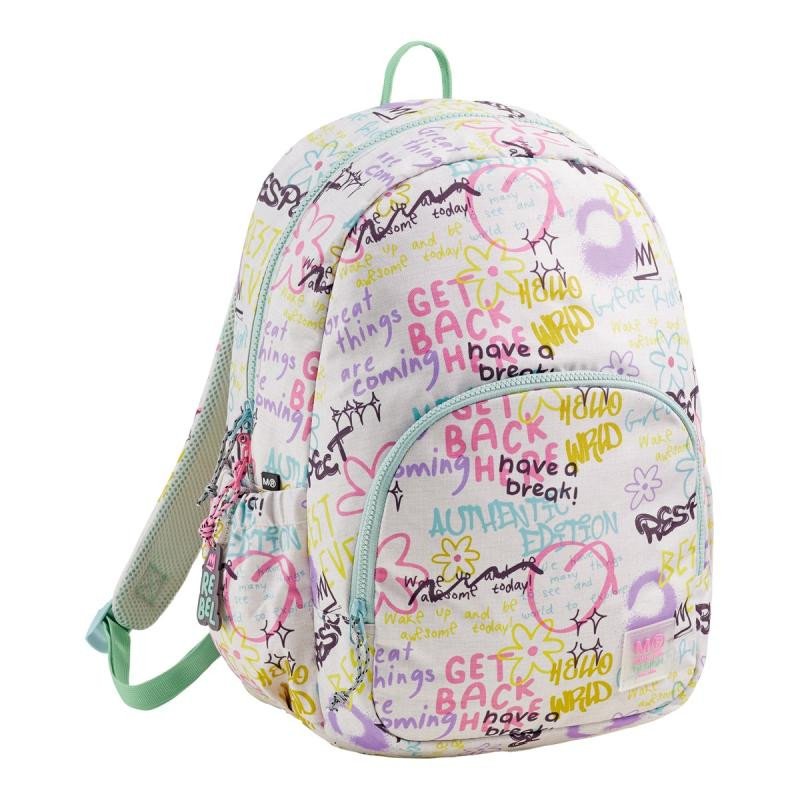 Moderní, lehký batoh v jemném barevném motivu určený začínajícím teenage holkám. Dělení na dvě kapsy poskytuje dostatek prostoru pro školu a osobní drobnosti. Recyklovaný odolný materiál prodlužuje životnost, zesílené výztuhy zespodu chrání batoh před poškozením a znečištěním. •rozměry: 400 × 280 × 160 mm •materiál: recyklovaný polyester (rPET) •2 kapsy na zip, síťovaná kapsa na drobnosti •2 otevřené boční kapsy na láhev