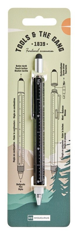 Multifunkční kuličkové pero spojuje elegantní psací nástroj s pěti užitečnými funkcemi, které využijete doma, v kanceláři i na cestách. Skvělé vychytávky, které máte vždy po ruce. Kromě kuličkového pera obsahuje pravítko v centimetrech i palcích, vodováhu, plochý a křížový šroubovák a dotykový stylus pro smartphony a tablety. Modrá náplň, inkoust na olejové bázi, který hladce klouže po papíru.