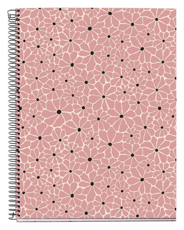 Kroužkový blok v kartonových deskách, potažený matným tištěným papírem. Výrazný motiv květin, kontrastní černá spirála.