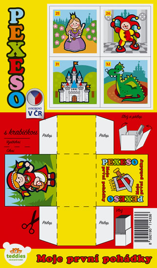 Papírové pexeso obsahuje 32 dvojic s veselými obrázky na motivy klasických pohádek.