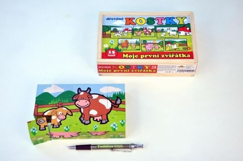 Dřevěné kostky s barevnými obrázky domácích zvířátek jsou výborná volba pro nejmenší. Při jejich správném poskládání se zobrazí jeden ze šesti obrázků, hra tím napomáhá rozvíjet u dětí logické uvažování, fantazii a jemnou motoriku. Při stavění a bourání komínů děti zjistí, jak funguje rovnováha a pomůže jim to v chápání příčiny a následku.