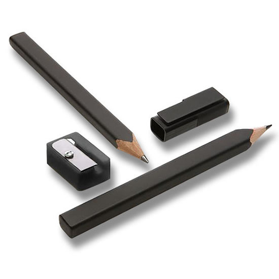 Sada dvou černých grafitových designových tužek, uzávěru a ořezávátka. Balení obsahuje 24 samolepek.