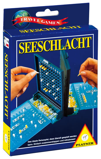 Cestovní verze hry Námořní bitva. Každý hráč si otevře sklopenou desku s tím, že černá část stojí kolmo, aby bránila pohledu soupeře na Vaši hrací plochu a naopak. Hráč si na spodní průhlednou část libovolně rozmístí 5 lodí. Mohou být umístěny vodorovně i kolmo. Oba hráči mají stejný počet lodí o stejných velikostech. Začíná bitva. Začínající hráč uvede při střelbě písmeno od A do J a číslici od 1 do 10. Vyšle svoji střelu na příslušné souřadnice svého protihráče. Protivník musí oznámit buď "vedle" (střela dopadla mimo lodě) nebo "zásah" (střela zasáhla některé plavidlo). Pokud se jeden z hráčů postupně trefí do všech částí jedné z nepřátelských lodí, její kapitán je povinen ohlásit, že je "loď potopena". Vztyčená černá deska představuje protivníkovo moře, v případě zásahu si vloží střílející hráč do kolmo stojící desky žlutý kolíček, aby měl přehled o stavu soupeřovy flotily. Bílé kolíčky slouží jako pomocné signály označující místa, kde jsme soupeře nezasáhly. Ve střelbě se oba hráči střídají. Konec hry: Jsou-li zasaženy všechny lodě jednoho z hráčů, jejich "kapitán" prohrává. Vhodné od 7 let.