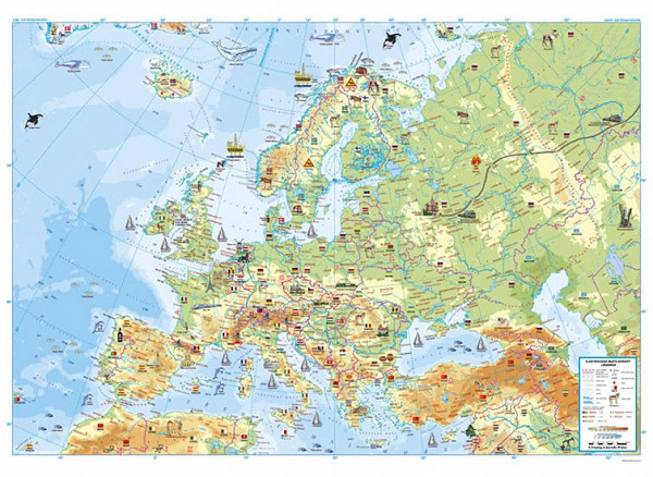 Mapa Evropy doplněná ilustracemi. Mapa je laminovaná.