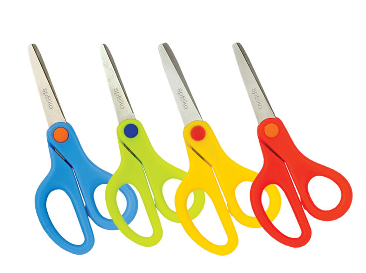 Školní nůžky vel. 13 cm se zakulacenou špičkou a měřítkem na čepeli. Délka nerezové čepele 8 cm. Asymetrické rukojeti jsou kryty měkčeným plastem v různobarevném provedení. Balení: 1 ks/blistr.