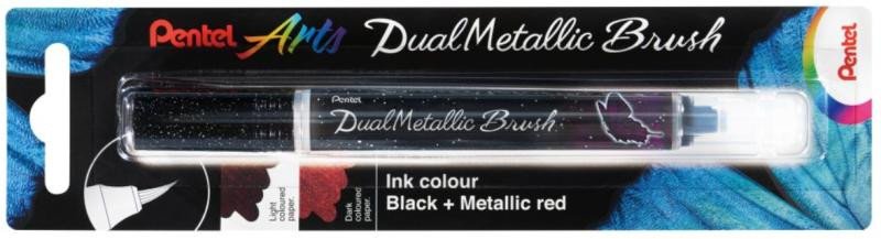 Pentel Arts Dual Metallic Brush popisovač se štětečkem black DAX • třpytivá sytá stopa mění barvu podle použití na bílý nebo černý papír • štětec s nylonovými vlákny s tekutou, metalickou barvou v zásobníčku a praktickým tlačítkem pro ovládání toku inkoustu • barva skvěle stéká po přesně řezaných vláknech štětce a je možné nanášet tenké i silnější stopy • vlákna nylonového štětce jsou velmi flexibilní a umožňují tloušťky čar v rozmezí od 1 do 10 mm • inkoust je na vodní bázi, lze jej na akvarelovém papíru rozmývat do ztracena, ale třpytivé efekty zůstávají • vhodné pro krasopis, bujo journal, zdobení, dekoraci, zvýraznění, tvoření • odolné plastové tělo s víčkem
