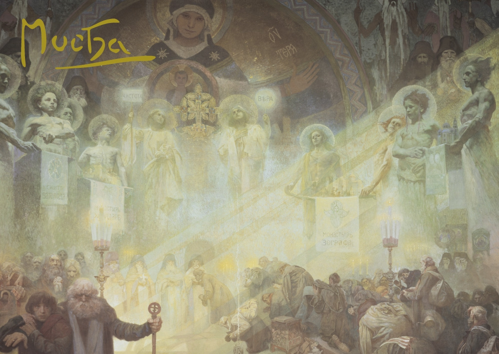 Pohled Alfons Mucha Slovanská epopej – Mont Athos (Svatá hora), krátký