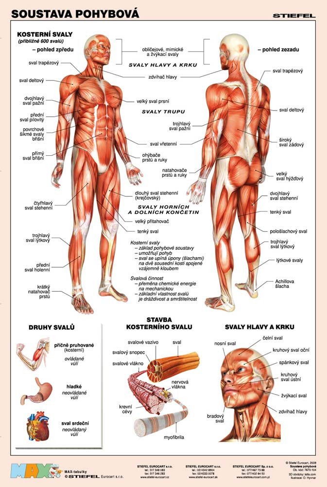 Didaktická pomůcka s výukovým tématem „stavba těla a funkce jednotlivých orgánů člověka“ je věnována pohybové soustavě. Obsah naučné tabulky je rozdělen na tři části: kosterní svaly a jejich struktura, druhy svalů, svaly hlavy a krku. Zadní strana je bez textu a slouží k procvičování a zkoušení.