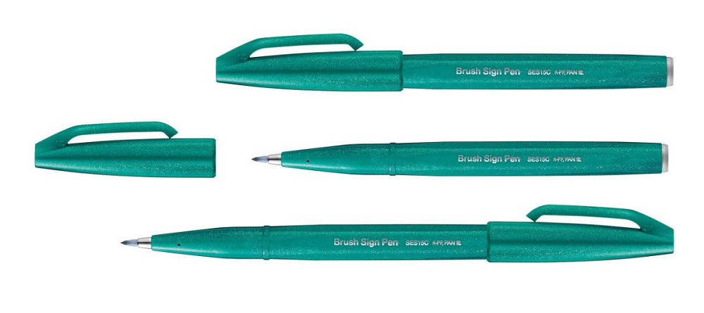 Brush pen popisovač Pentel SES15 Sign Pen se štětečkovým hrotem v kovové objímce, jsou vhodné i pro začátečníky, kteří teprve krasopis, handlettering, lineart poznávají. Hrot se přizpůsobí tlaku psaní a vytváří od extra jemných po středně široké stopy, vlákna štětetečku brush pen Sign Pen Pentel se vždy vrátí do původního tvaru. Štětečkové popisovače Pentel SES15 lze využít i pro akvarelovou tvorbu, inkoust je na vodní bázi, je rozmývatelný vodou. Plastové tělo s ergonomickým úchopem, včetně víčka s klipem vyrobeno z 81% recyklovatelného materiálu. Sign Pen Brush - známý na sociálních sítích jako „Pentel touch“ . Skvělé pro začátečníky pro handlettering, kaligrafii, kreslení, ilustrace, akvarely, pokročilým uživatelům lze doporučit pro lineart, ombré efekty, blanding.