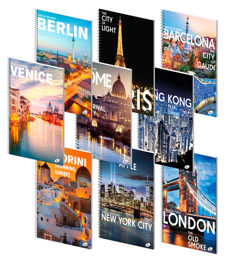 Světové metropole zachycené na fotografiích tvoří kolekci obalů kvalitních poznámkových bloků. Pevná obálka s matným povrchem a lesklým lakem zvýrazněnými detaily ve vazbě stříbrné dvojité spirály. Formát bloku A4, 70 listů (papír 70 g), linkovaný. Celkem 9 různých motivů. Balení: 25 ks.