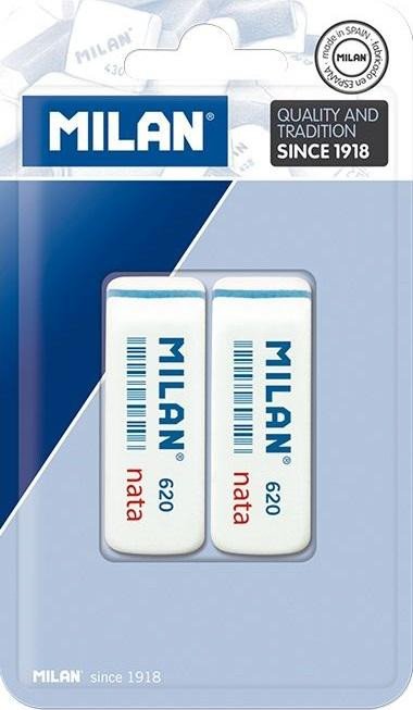 Bílá plastová guma Nata. Hladká, univerzální a neabrazivní. Nepoškozuje papír. Bílá zkosená guma s vodorovným pruhem. Velikost gumy: 5,6 x 1,9 x 1,2 cm.