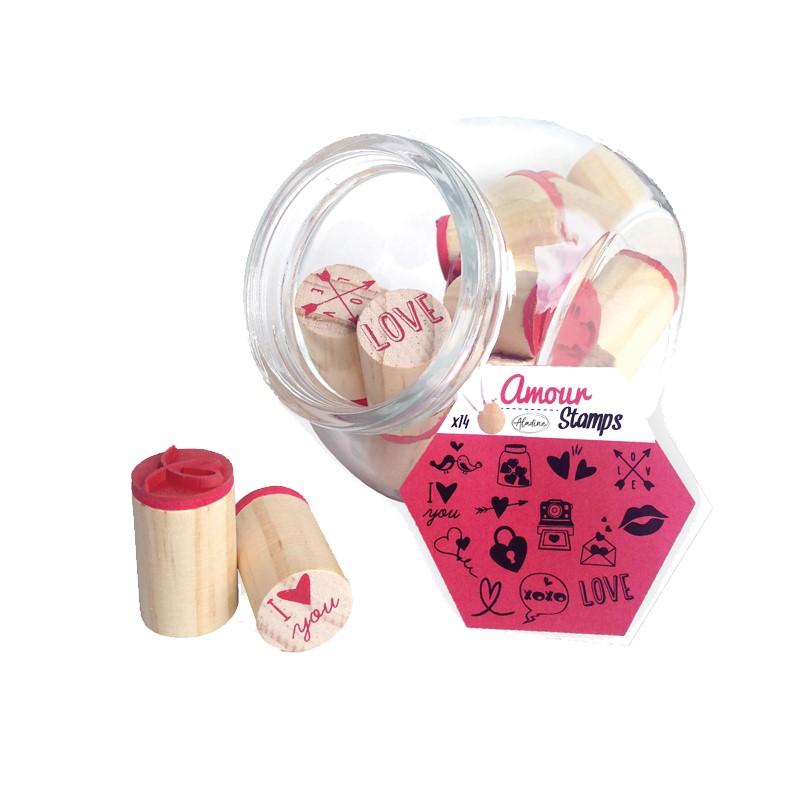 Dřevěná razítka v praktické skleněné dóze s motivy srdíček. Ideální jako diářová razítka, k dozdobení stránek, deníků i jako hodnotící razítka pro paní učitelky. Sada 14 razítek a 1 razítkovací polštářek.