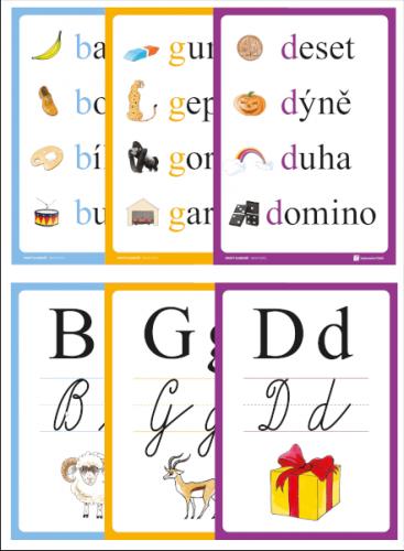 Na zadní straně je několik slov v psaném tvaru, která na písmeno začínají, spolu s odpovídajícími obrázky.