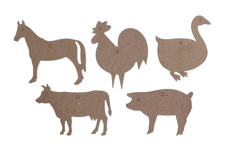 Sada lepenkových výřezů ve tvaru zvířátek z farmy. Po dozdobení můžete své výtvory zavěsit jako součást dekorace nebo přilepit na špejli a můžete se zvířátky hrát divadlo.