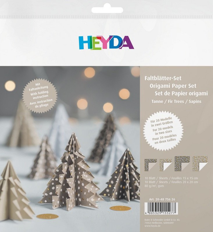Sada obsahuje 20 listů ve dvou velikostech (15×15 cm, 20×20 cm) a dvou barvách. Gramáž papíru 80 g/m2. Vysoce lesklá zlatá povrchová úprava. S návodem k překládání. Origami je stará japonská technika skládání papíru.