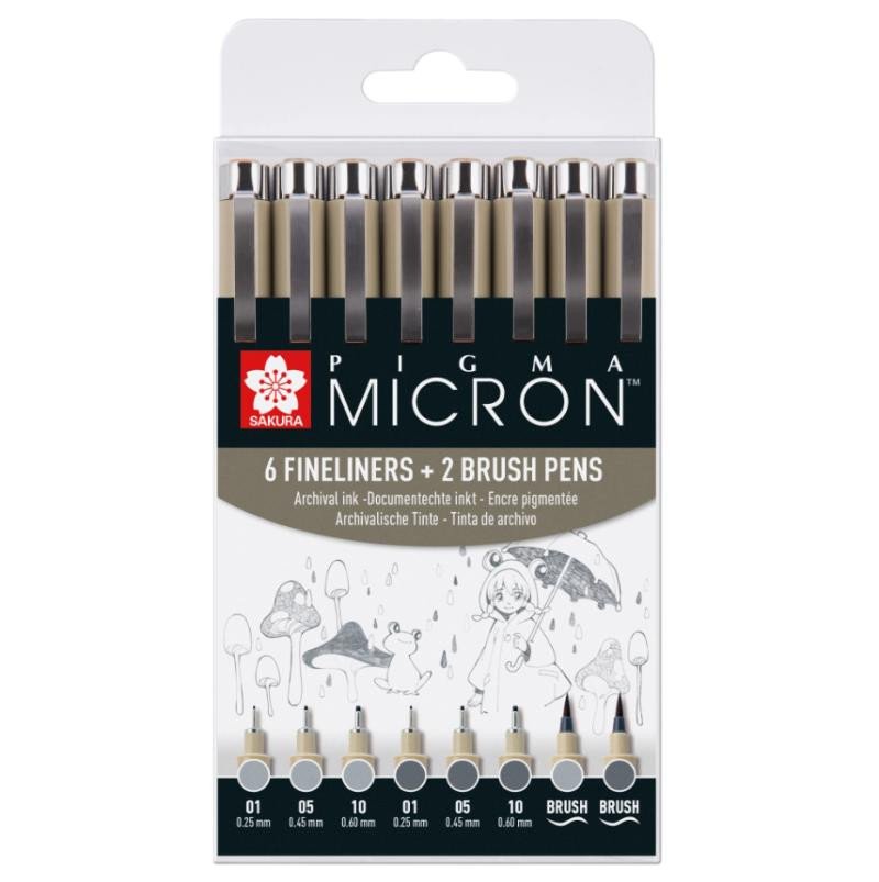 Výběr 4 světle studených šedých a 4 studených šedých Pigma Micron a štětcových per: Pigma Micron 01 (0,25 mm), Pigma Micron 05 (0,45 mm), Pigma Micron 10 (0,60 mm) a Pigma Brush. S těmito stavitelnými šedými barvami můžete přidávat stínování, hloubku, vizuální akcenty a efekty vrstvení do ilustrací, kreseb, rozpisů bullet journalu a mnoho dalšího. Pigma Micron je první fineliner profesionální kvality na světě s pigmentovým inkoustem na vodní bázi. Inkoust Pigma rychle schne, je odolný proti krvácení a po zaschnutí je voděodolný. Vhodný pro všechny světlé povrchy papíru. Díky dlouhému kovovému hrotu je fineliner ideální pro použití s pravítky a šablonami.